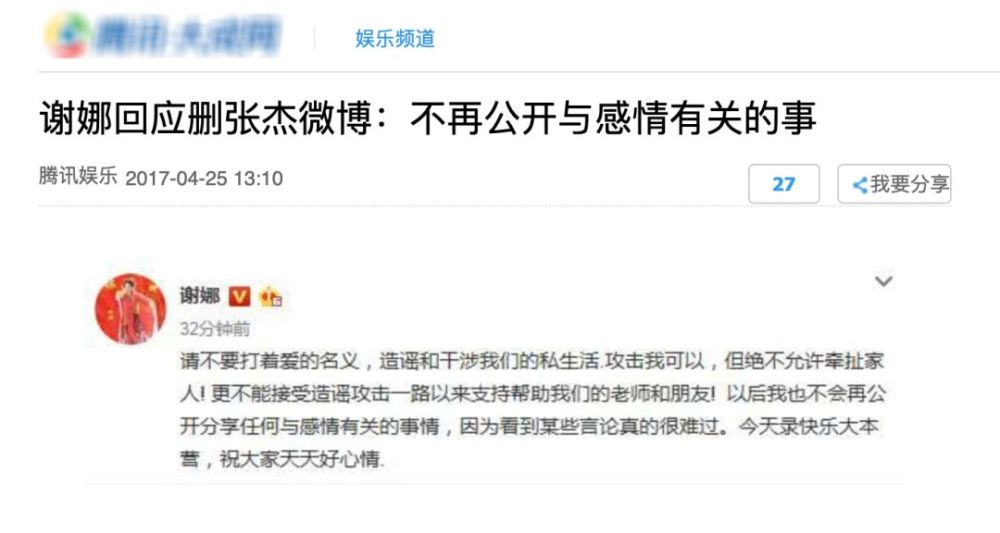 之后谢娜还发文表示请不要打着爱的名义造谣和干涉他们的私生活,称看到某些言论很难过。